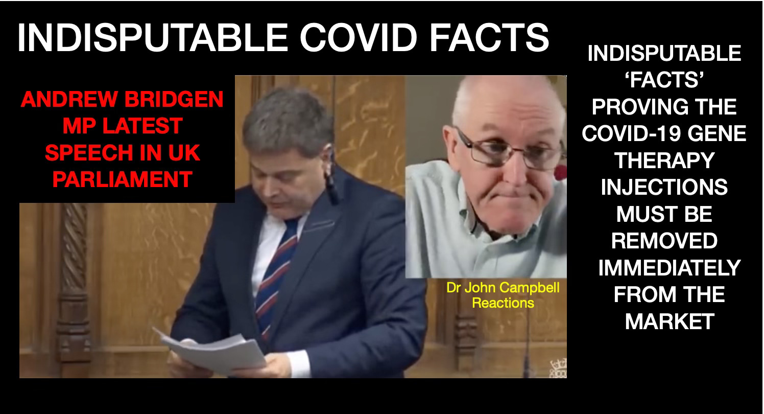 Perhaps the most disgraceful fact remains that when Andrew Bridgen stands up in the UK parliament to deliver known FACTS about this whole COVID affair, most MPs walk out and cannot even be bothered to listen to the evidence that is clearly being laid before the parliamentarians who are supposed to represent their constituents. Dr John Campbell, who is now believed to be one the most trusted and honest sources of ‘FACTS’ in medicine, states that it was absolutely OUTRAGEOUS’.